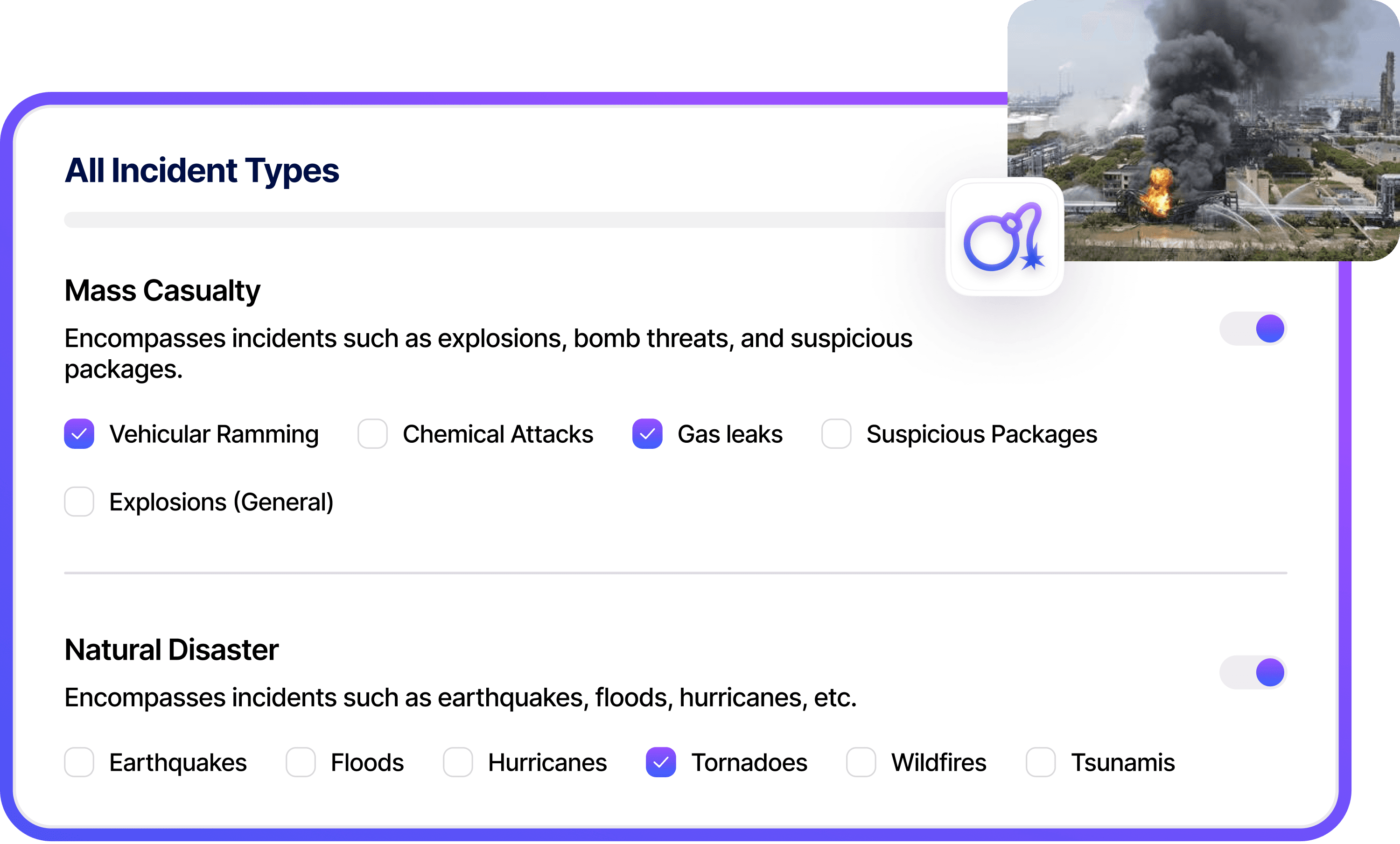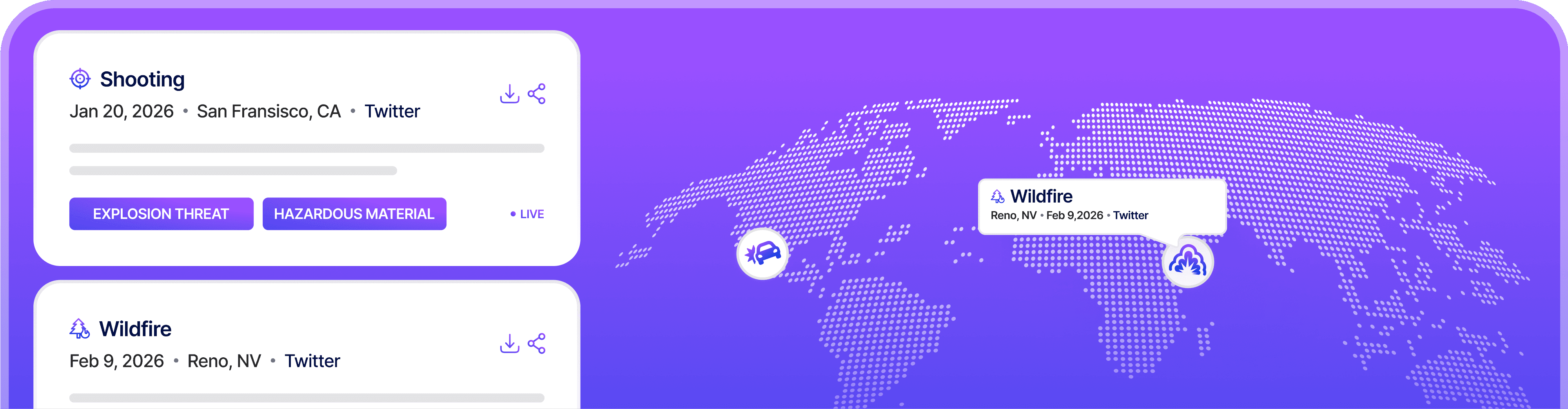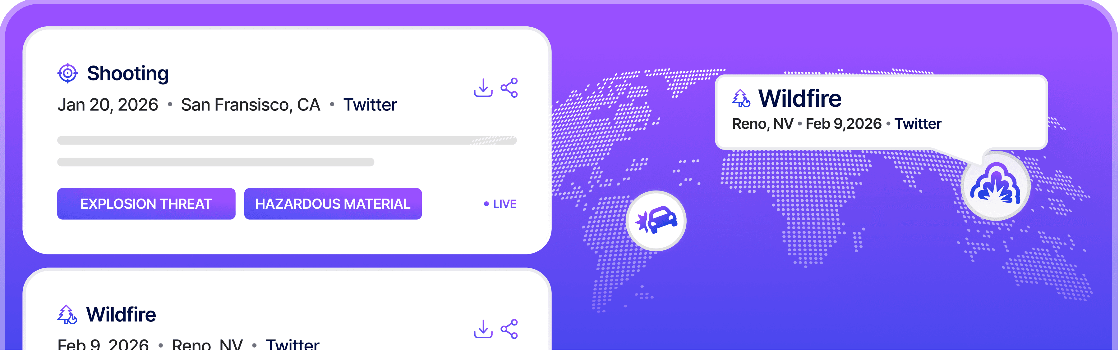 Detect fires, natural disasters, accidents, or political unrest in the operational vicinity, protecting employees, facilities, and uptime across critical locations.